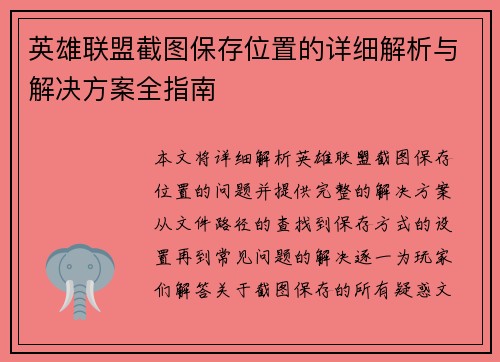英雄联盟截图保存位置的详细解析与解决方案全指南